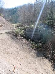 パンケホロカ林道から分岐し、山へ上って行くパンケホロカ3号林道は途中ガレ場も多く、現在は歩くこともままならない状態です。この道が排気立坑、風洞立坑まで通じています。