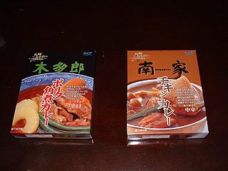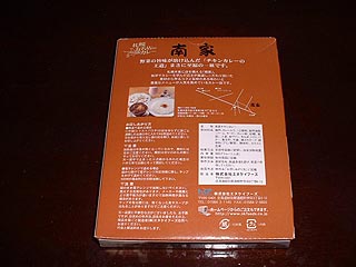 札幌の有名スープカレーがレトルトカレーになった商品。千歳空港などでも見かけましたが私はミステリースポット東名高速下り線港北パーキング売店にて購入しました。レトルトになったカレー店は木多郎、南家、天竺の三店でそのうち二店のものを購入しました。最近は各店のバリエーションで計七点がある模様です。発売元は遠軽町のエヌケイフーズ。箱の裏には店の案内と地図も付いていて親切でした。どのパックも具が大きく食べ応えがあるのが特徴です。