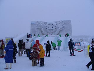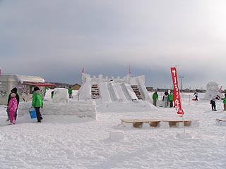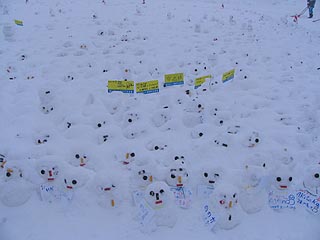 ラヴだるま。小さな雪だるまをつくって首にメッセージを書くことができます。たくさんの雪だるまが並んでいましたがあいにくの雪で半分埋もれかかっていました。