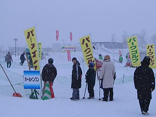 雪の上でパークゴルフ。ホールインワンを狙います。