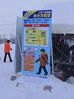 つるつる路面歩き方教室。様々な路面を実際に歩いて体験することができます。つるつる、坂道、でこぼこと変化に富んだコースを歩き方を教えてもらって歩いたり、砂を撒いて歩いたりします。