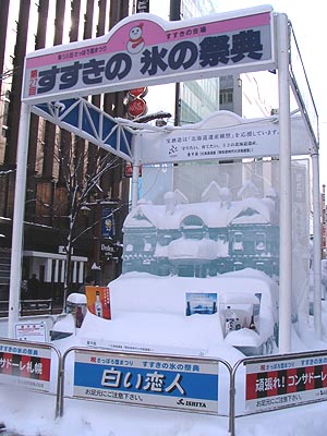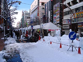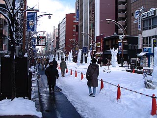 昼間の会場。普段は車道になっている道路中央部分に氷像が並んでいます。