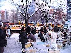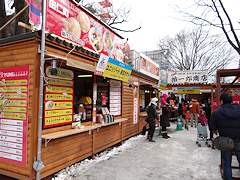 大通会場の6丁目は「北海道食の広場」と名付けられた北海道各地の名産品を味わうことができる空間です。大通会場のちょうど中間に位置し、食事をするには最適な場所といえるでしょう。平成19年から設置された空間で初回ではB級グルメ系を中心に北海道フードパークが15ブース、札幌フードパークが4ブースと計19ブースの店舗が並びました。平成28年度は1丁目北の酒BAR、9丁目グルメトレインを含めた編成です。