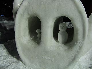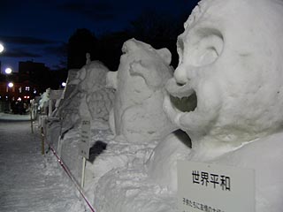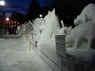 終点は札幌市資料館 大通会場の西に終点は12丁目でその終点に札幌市資料館があります。11丁目は「世界広場」で小雪像中心ですのでイベント開催時以外は人も少ないです。但し11丁目には平成21年の雪まつりでは「食の世界交流コーナー」が設けられるのでそちらには人が増えるかもしれません。 12丁目の小雪像群。雪像はその年の流行を反映します。 かわいい雪像もたくさんありました。