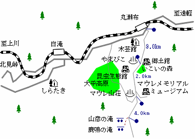 (交通:遠軽-[JR特急17分]-丸瀬布-[JR特急18分]-白滝-[JR特急40分]-上川)