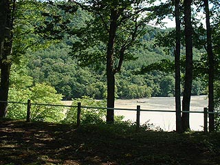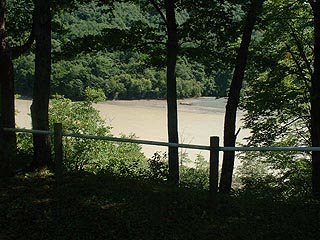 岩内園地から見下ろしたダム湖。平成15年の台風10号の災害直後ということもあり湖は汚濁していました。またこの湖は以前から堆砂が多くその対策が課題となっているダムでもあります。ダム下流部には稼動中の採石場あり。また付近には新日東鉱山というものもあったらしいのですが詳細は不明です。