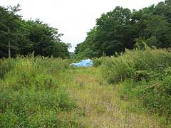 平成22年9月の笹森駅跡。踏切から駅を眺めてみたのですがホームは消え去っていました。そして小屋の方角を眺めるとブルーシートがあるのみでした。近寄ってみると小屋の残骸が残されていました。駅ノートはどうなったのでしょうか。