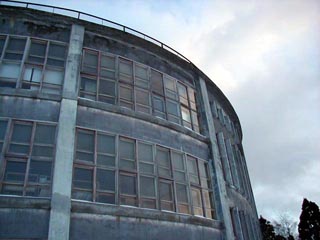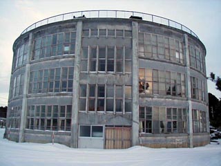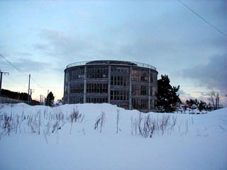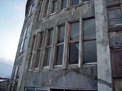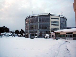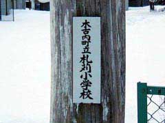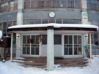泉沢小学校と比べると規模も一回り大きい円形校舎です。江差線の脇に立つ校舎は周りにさえぎるものもなく壮観なのですが、泉沢小学校の外壁が近年塗りなおされたのに対し、こちらは昔ながらの外観を保っていてちょっとおどろおどろしい雰囲気です。平成15年元旦の校舎は人気もなくひっそりとしていました。玄関の正月飾りもこの時が最後だったに違いありません。