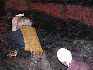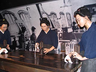 坑内の明りの安全灯を整備する安全灯婦。電池式の安全灯の普及により姿を消しました。