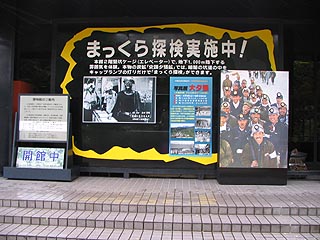 石炭博物館入口のまっくら体験の看板。キャップランプが本物で味のあるものです。