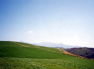 瀬棚の牧場風景は変化に富んでいてとても楽しいものでした。立象山展望台などから北に見る風景は背後に狩場山が白い雪をまだかぶりながらでんと座っています。また牧場の中を走る道路から西を見ると牧草地がぷつんと切れ青い海が広がっています。雄大さだけではここに勝る牧場はたくさんありますが周りの風景と調和した本当に感じのいい場所なのです。偶然訪れたこの牧場で私は大変満足したことは言うまでもありません。