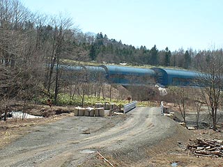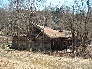 写真左は穂別ダムの脇を北上し石勝線をまたぎ最終民家を越し穂別川を渡った場所からのもの。穂別川を渡る橋は強度の問題のためか仮設の橋に切り替えられていました。平成15年の台風による劣化もしくは北海道横断自動車道の工事車両の通過のためと思われます。写真右はその橋の脇にあった商店跡の廃屋。