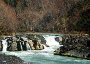 ■空知大滝の様相 やはり主要河川の滝ということで落差は残念ながらありません。 しかしながら滝とその下流一体は険しい渓谷が形作られていて、白い飛沫が舞っています。