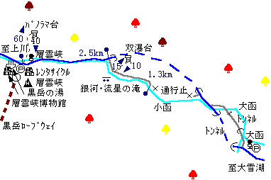 ■層雲峡の滝と紅葉 大雪山の紅葉は9月に山の頂きからはじまります。 そして少しづつ山を下り層雲峡には10月中旬〜下旬に紅葉がやってきます。 温泉街と国道からもその風景は簡単に眺めることができるのがうれしいところ。 黒岳ロープウェイからも変化する紅葉の様子が観察できます。