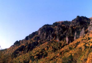 ■柱状節理と紅葉 層雲峡の渓谷の特徴である柱状節理の断崖の周りに紅葉が広がります。 黄色が主体で谷全体が黄色く染まります。