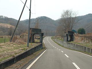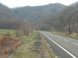 写真左のは牧草地の中にぽつんと尺別給油所の跡。写真右はその先を見渡したもの。左手の牧草地にはかつては緑町二区の炭鉱住宅が立ち並んでいました。広い歩道がかつての賑わいを感じさせます。