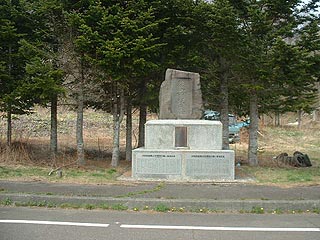 写真左は尺別炭鉱に向かうと初めに見えてくるのがかつての尺別鉄道が上を走っていた跨道橋の跡。歩道部分もしっかり造られた構造は今の風景からは想像できないがそれなりの市街が広がっていたことを彷彿させます。写真右は復興記念碑。第14期尺別中学校同期会記念樹なども近くにあります。