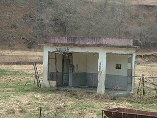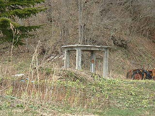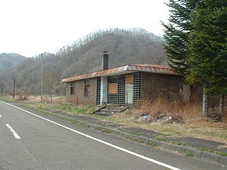 新尺別駅の周辺はかつては役場の支所、郵便局、警察や炭鉱住宅が立ち並んでいましたがの名残はほとんどありません。写真左は新尺別駅跡にある給水施設、写真右の倉庫として使用された形跡のある尺別生活館跡などがわずかに残るだけでした。