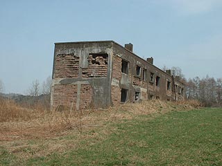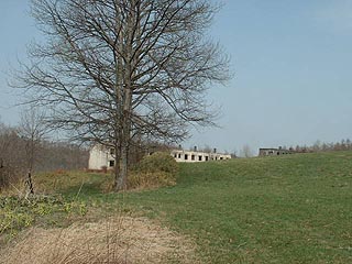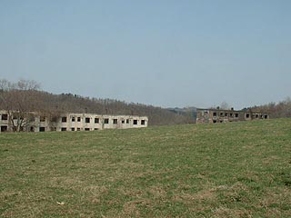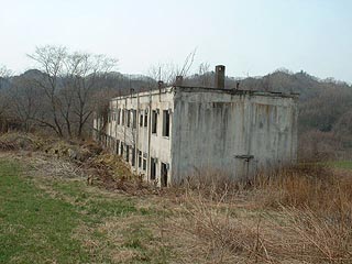 跨道橋から南の牧場を横切る道があり、さらにその道は丘の上の牧草地まで続いています。そこにぽっかり姿を現すのが二つの炭鉱住宅です。あまり見慣れない不思議な光景ですがこの丘は栄町と呼ばれ、炭鉱住宅街が広がっていました。