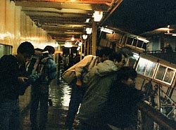 喧騒に包まれた船内で過ごした4時間は瞬く間に過ぎ去り函館港に入港します。デッキには夜にもかかわらずやはり多くの人が立ちタグボートの羊蹄丸を押す姿や函館へ入港する光景を見守ります。函館駅は桟橋から待合室までこうこうと明かりがともり不夜城を思わせますが、それも明日で最後を迎えるのです。