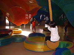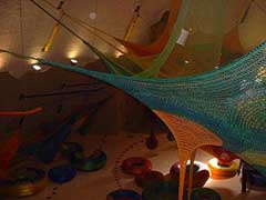 室内にネットが張り巡らされその中を行き来したり垂れ下がったボールにぶら下がったりすることができる遊具。ネットは幾層にもなっていてその中に穴が開いていて幼稚園年中以上ならその穴を抜けて上部まで行くことができかなり楽しい。ネットの張り巡らされた下にはタイヤ状のものが並んでいてネットに登るための台にしたり幼稚園入学前の子供を遊ばせておくのに便利です。大きなタイヤ状のものは実は大人の休憩にも最適で人の少ないときには何人もの大人がのっかったシュールな光景を見ることができます。またぶらさがりボールは大人がのっかり揺らすとドーム全体がゆさゆさと揺れるのでやらない方が無難です。私が行った時も若い女性がのっていたのですが知らずにネットを揺らす様には笑いを禁じえませんでした。小さな休憩室も隣接して有。