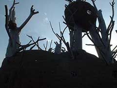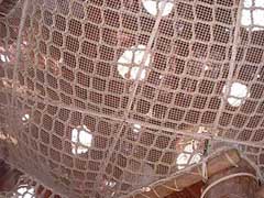 鳥の巣を模したアスレチック系の小さな遊具。2階建てになっていて登ることができます。登りはネットなどをよじ登ることになるので幼稚園児以上位が対象になるのでしょう。混んでいる時は譲り合いの心が大切です。 1階部分から見上げた鳥の巣の心臓部。 ブランコスタイルの遊具が付いていますが実際のところあまり揺れはしません。