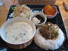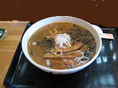 写真左は秋のスペシャルきのこシチューは秋の限定メニュー。写真右は滝野の味噌ラーメン。食事のメニューは山のよくばりグラタン、エビフライプレート、そばうどんやカツカレーなど多彩です。東口休憩所では軽食もとることができます。