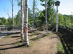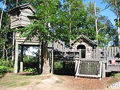 「こもれびの森」のエリアにも遊具が幾つかあります。そのメインが「森の隠れ家」です。木でできた小さな家が繋がっていて、走り回れるようになっているのです。「探検の森」からも「トロッコ橋展望台」の前を通ってすぐのところにあるので一体で遊ぶことができるのです。