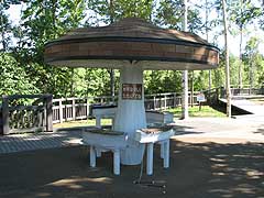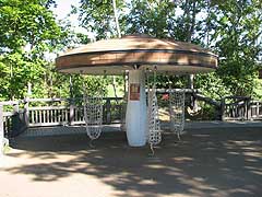 左はきのこ型の遊具の「ゆらゆらきのこ」。ハンモック風のネットにのってゆらゆら揺らして遊ぶのでしょう。右は「メロディーきのこ」。木琴がぐるりと並んでいて鳴らすことができます。
