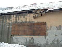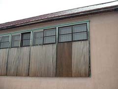 渡り廊下と体育館アップ。渡り廊下の屋根の一部が壊れていましたが概して保存状態は良好です。
