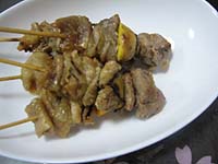 やきとりはネギマなど普通はモモ肉を使いますが、美唄やきとりの特徴はまるごと一羽を使い切るというコンセプトの基で、数種類のモツとたまねぎを一本にまとめたモツ串があるということです。