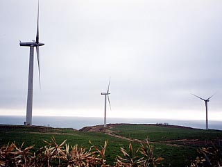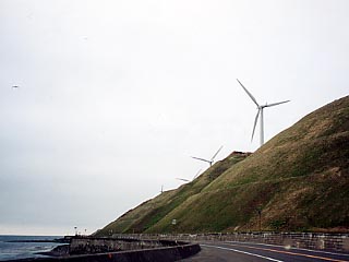 残念ながら上平牧場の内陸への道は通行が禁止されていますが海沿いの高台の上を通るダートは走っていくことができます。好きなところでちょっと車を止め、風車を仰ぎ見るのがいいかもしれません。動いているときの風車は何気になかなかの音を発しているのがおもしろい。