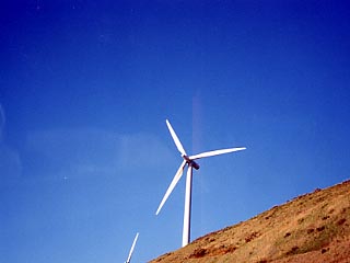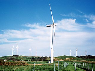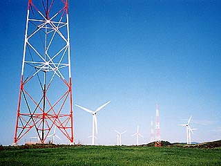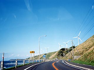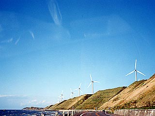 秋の苫前、青空の下の風車は風を受け元気に回転していました。上の画像は風車のある段丘の上で撮影したもの。赤と白で塗り分けられた鉄塔と風車の対比もいいものです。 国道からの風車群。段丘の際に立つ風車は見上げるように望むことができます。 (地域別情報4-18-2.苫前に地図と周辺案内があります。)