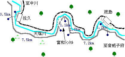 ■富和トンネル旧道を行く 音威子府から中川へ至る天塩川は流域の中で最も急な流れとなります。 山がすぐ川まで迫り、その狭い中を左岸に国道40号線、右岸にJR宗谷本線がはしります。 この交通路が整備される前にはこの天塩川が交通のルートとなっていました。