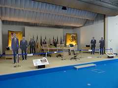 平成20年7月に開催された洞爺湖サミットの記念館は道南バス洞爺湖温泉バスターミナルも併設された洞爺湖観光情報センターの3階にあります。以前は入場料400円だったようですが現在は入場料無料。 ステージには円卓と座ることが許された椅子が一脚。長机も立派なもので展示しておくだけでは惜しいものでした。その当時の各国首脳の写真が並んでいるので工夫をすれば一緒にいる雰囲気で写真撮影も可能でした。 地球温暖化に関する資料なども展示されていました。