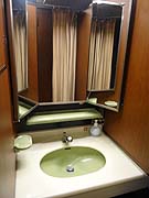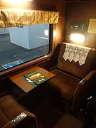 利用したシングルツインは車輌中央に通路があり両サイドに部屋があるためドアと席の隙間が非常に小さく大人2人利用では少々憚られる広さですが、補助ベッド使用料金を払えば2人利用もできます。向かい合わせの席は奥の幅が広い席と入口近くの幅が狭いものがあります。8、9、10号室が海側、11、12、13号室が山側。BGM装置、コンセント完備、備品は浴衣、スリッパ。