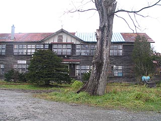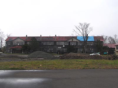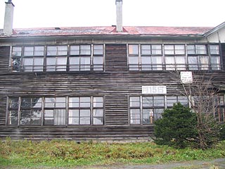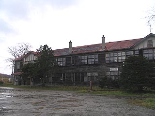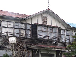 平成17年11月の雨煙別小学校 平成17年11月に再訪した時の雨煙別小学校です。平成16年9月の台風18号の被害で校舎の屋根の一部が吹き飛び、その模様は北海道新聞のサイトでも紹介されていましたが雨煙別小学校に注目している多くの人がいることが実感できた事件でもありました。屋根は部分的に補修が施されていました。 近づくと屋根がめくり上がっている部分もあり、老朽化している様子が伺えます。 体育館と旧雨煙別中学校校舎。