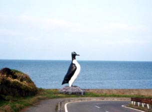 ■オロロン鳥の像羽幌港、天売港、焼尻港、国道232号の羽幌町の入口などにあるオロロン鳥の像。 ひょっこり立っている様子がペンギンに似ていてとてもかわいらしい。 かなり大きく記念撮影にもいいものです。天売島、焼尻島の土産物屋ではこのオロロン鳥のぬいぐるみを小さいものから大きいものまで扱っています。