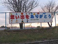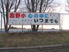 国道38号線沿いに優美な白亜の校舎が突然現れ、車を思わず停めてしまいました。吉野市街はそれなりの規模があり、その時には先入観から現役校と思い込んでいたのですが、吉野小学校は平成17年3月にすでに閉校になっていました。平屋のブロック造の校舎は一直線にかなり長く、その奥に比較的新しい体育館を有します。 暖かい看板が国道沿いに掲げられていました。(一部修正しています。) 平成12年3月に開校100周年を迎え、その際に建立された百年碑。