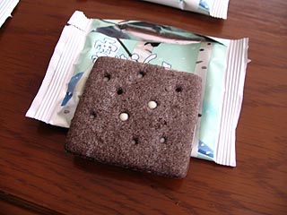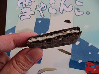 六花亭の平成19年の新商品で千歳空港でもストロベリーチョコに替わり大々的に宣伝されていました。ブラックココア入りのビスケットにホワイトチョコレートが挟んであるのですが、今までの六花亭のイメージとは若干違いあっさり風味なのです。これは何枚でもすぐに食べてしまうと思ってしまいました。オリーブ油などを使っているところなどから察するに若手の商品開発者の企画ではないでしょうか。