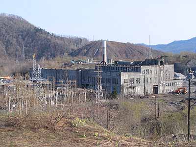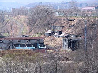 写真はその堰堤から眺めることができる平成15年5月の発電所。大正15年に建設された発電所は北炭真谷地鉱閉山に伴い大半の使命を終え、平成2年に廃止されました。平成8年より解体が進みます。ものものしい外観は健在ですが立ち並んだ煙突とベルトコンベアの斜路は撤去されています。かつて前知識なしに三菱石炭鉱業鉄道で清水沢から南大夕張に向かった際に突然現れた発電所に戦慄を覚えたことは今も深く記憶に残っています。