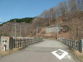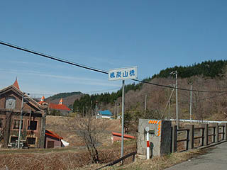 神社の脇にある鶴亀橋、下は川ではなく坑口に続く軌道跡。