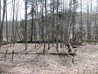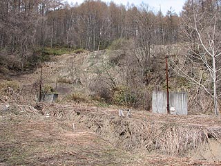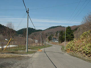楓の集落内を縫ってはしる道路。国道が南の新楓駅側に付け替えられる前は幹線道路でした。写真右はその北側山手のかつての炭住跡で笹原の階段状になっています。