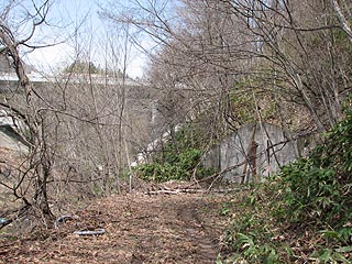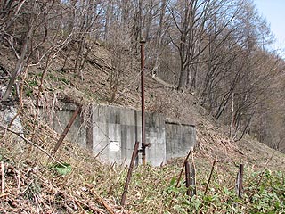 発電所脇に楓炭山橋がありその向こうにホッパーの跡がありました。