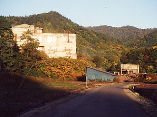写真左の高台の建物は昭和37年に竣工した総合事務所です。写真右は選炭工場の跡。