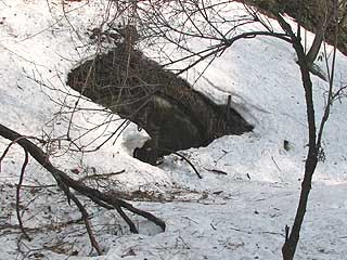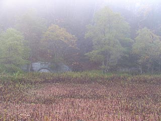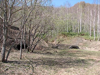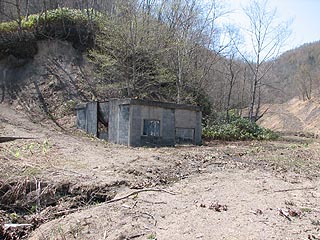 コンクリートで密閉された第二立坑とその奥には土で埋もれた第三立坑がありました。また脇には屋根が潰れた小さな建物もありました。」