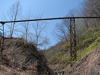 若鍋炭鉱の選炭場付近には配管が奥から続いていました。