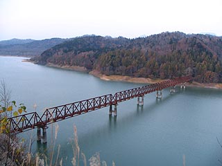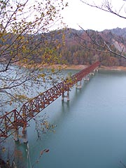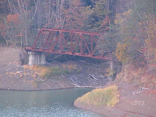 三弦橋は正式名称は下夕張森林鉄道夕張岳第一号橋梁と言い、シューパロダムにより既存の森林鉄道が廃止になる際に水没補償工事として建設されたものです。7径間全長381.8mの橋梁は上部工が特徴的な三角形の断面のトラス橋です。昭和33年に竣工したものの、森林鉄道は昭和38年に廃止され、その使命を終えました。シューパロダム完成時には残念ながら三弦橋は湖面に沈む運命です。