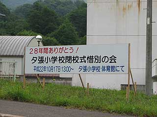 夕張小学校の朝 夕張市内の小学校は平成23年3月に夕張小学校、若菜中央小学校、緑小学校、のぞみ小学校、滝ノ上小学校が閉校になり、小学校は平成23年4月から1校に統合されます。先に中学校は平成22年3月に千代田中学校、清水沢中学校、緑陽中学校が統合され夕張中学校が平成22年4月に開校しています。 平成22年10月に合同の閉校式典と各校の閉校式典と惜別の会が相次いで開催されます。学校の前には案内の看板がありました。 小学校の様子を反対側から眺めてみました。