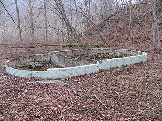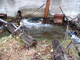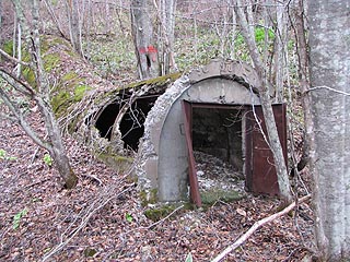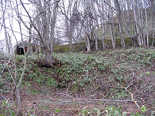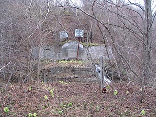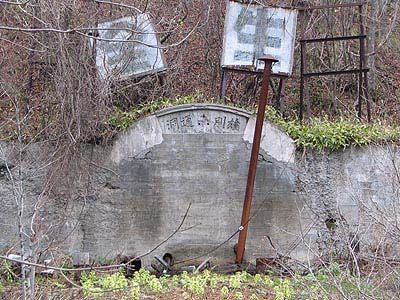 昭和13年に完成した雄別通洞。看板は「安全生産」と掲げられていました。今では「全」と「生」の文字のみがかろうじて残っています。直近の橋梁は撤去され密閉された坑口の下部からは地下水が湧き出ていました。